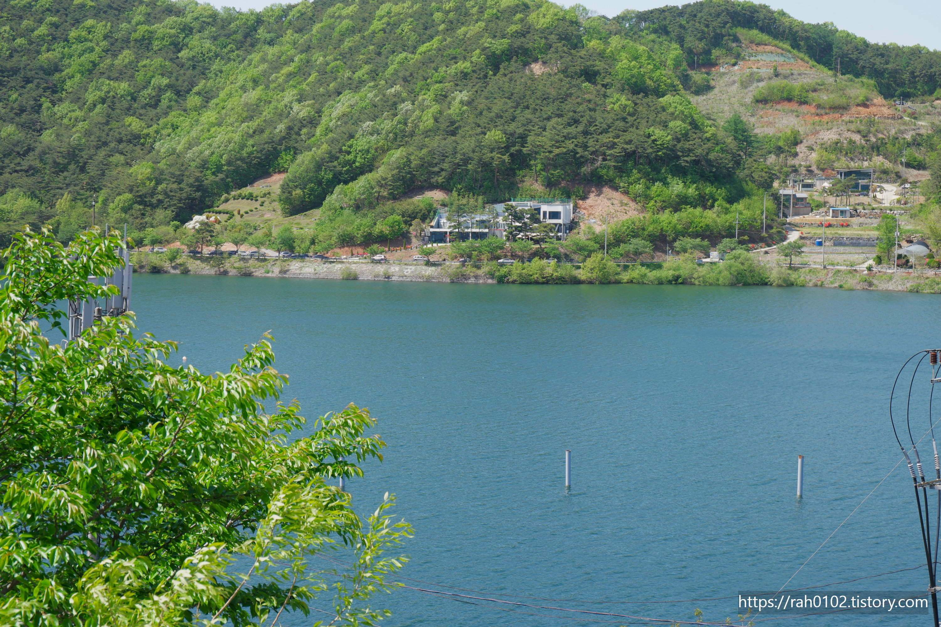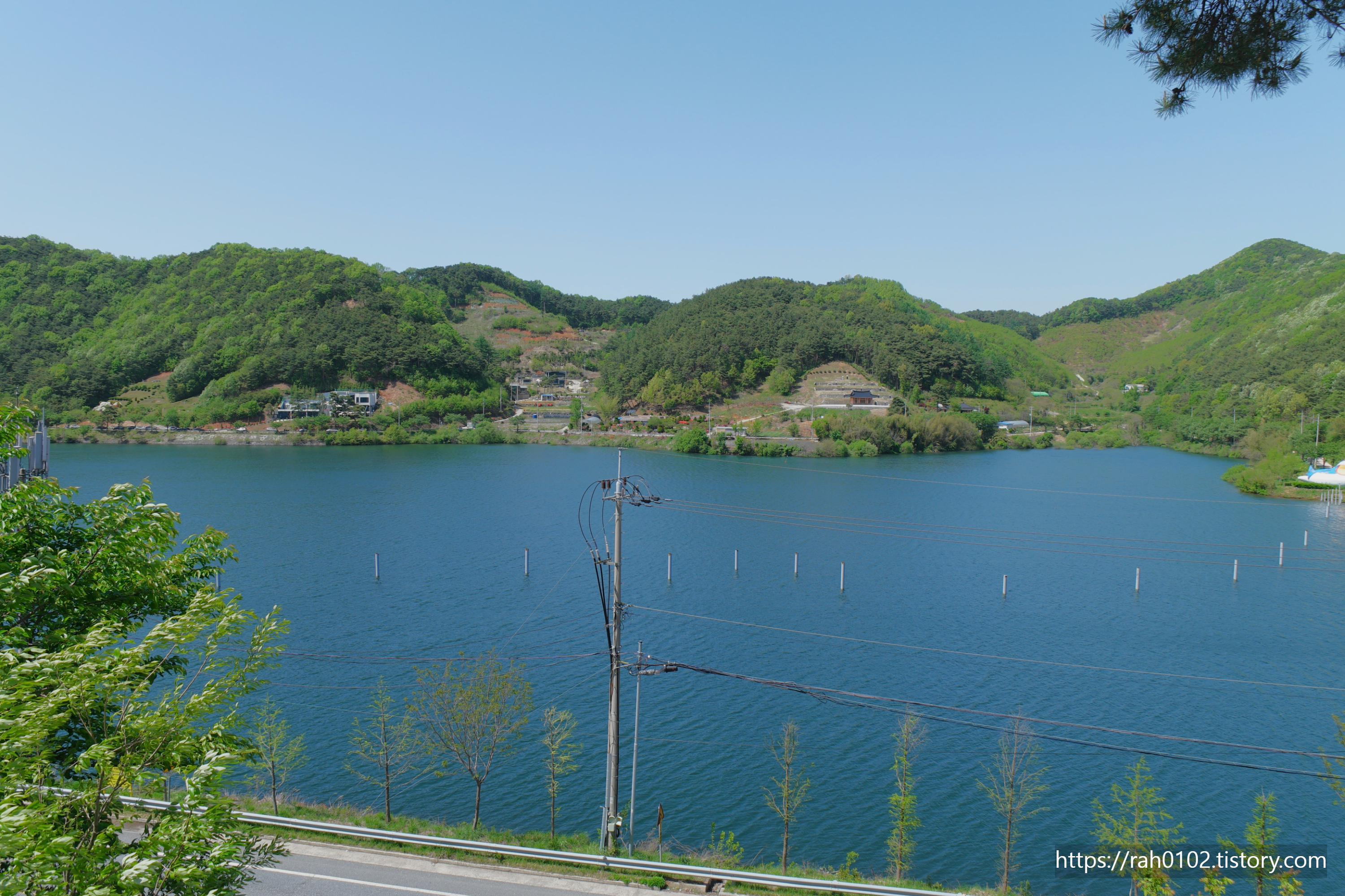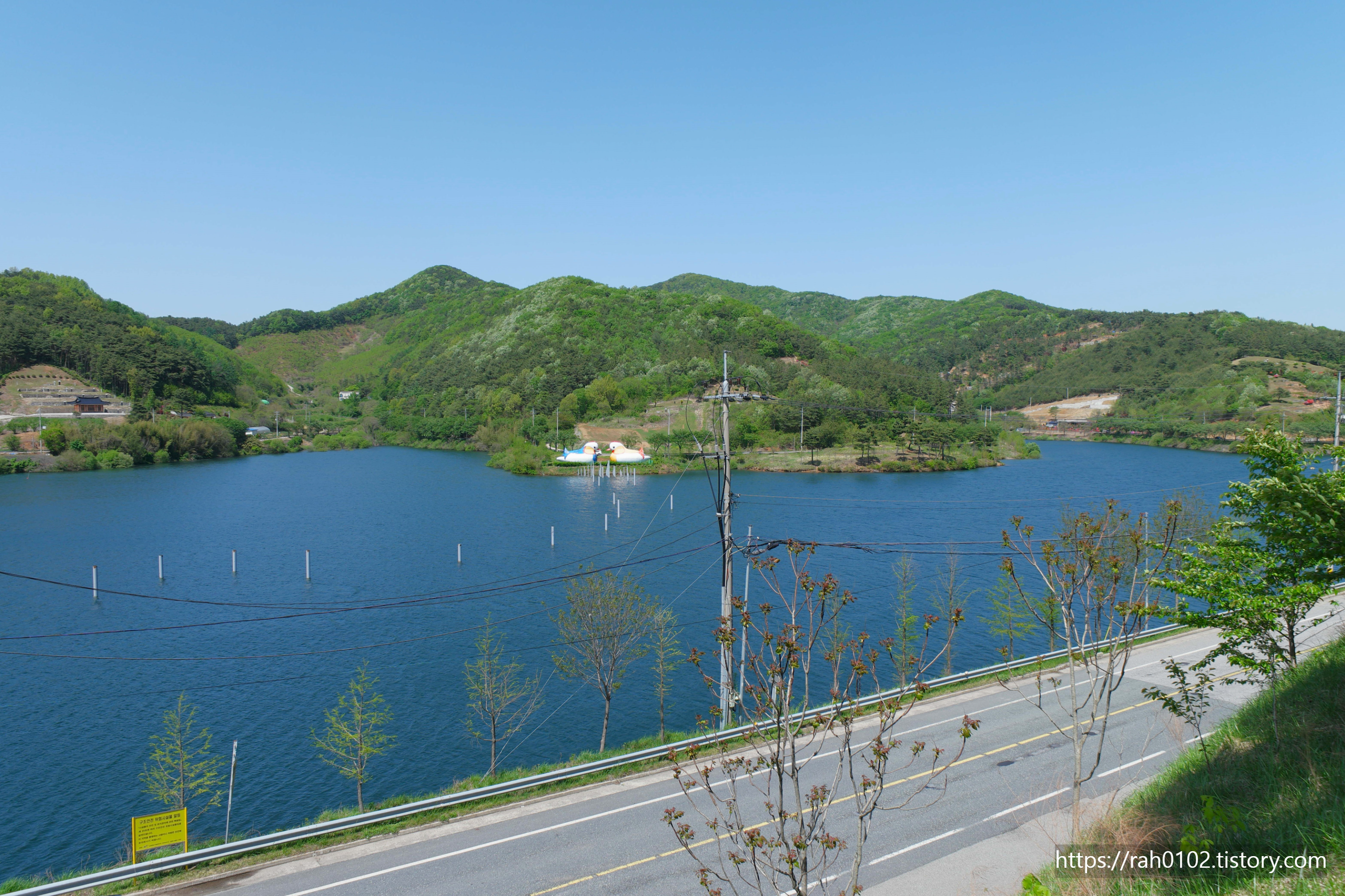 저수지 제방 위에 놓여진 도로를 따라 카페 콩매아로 가고 있습니다.