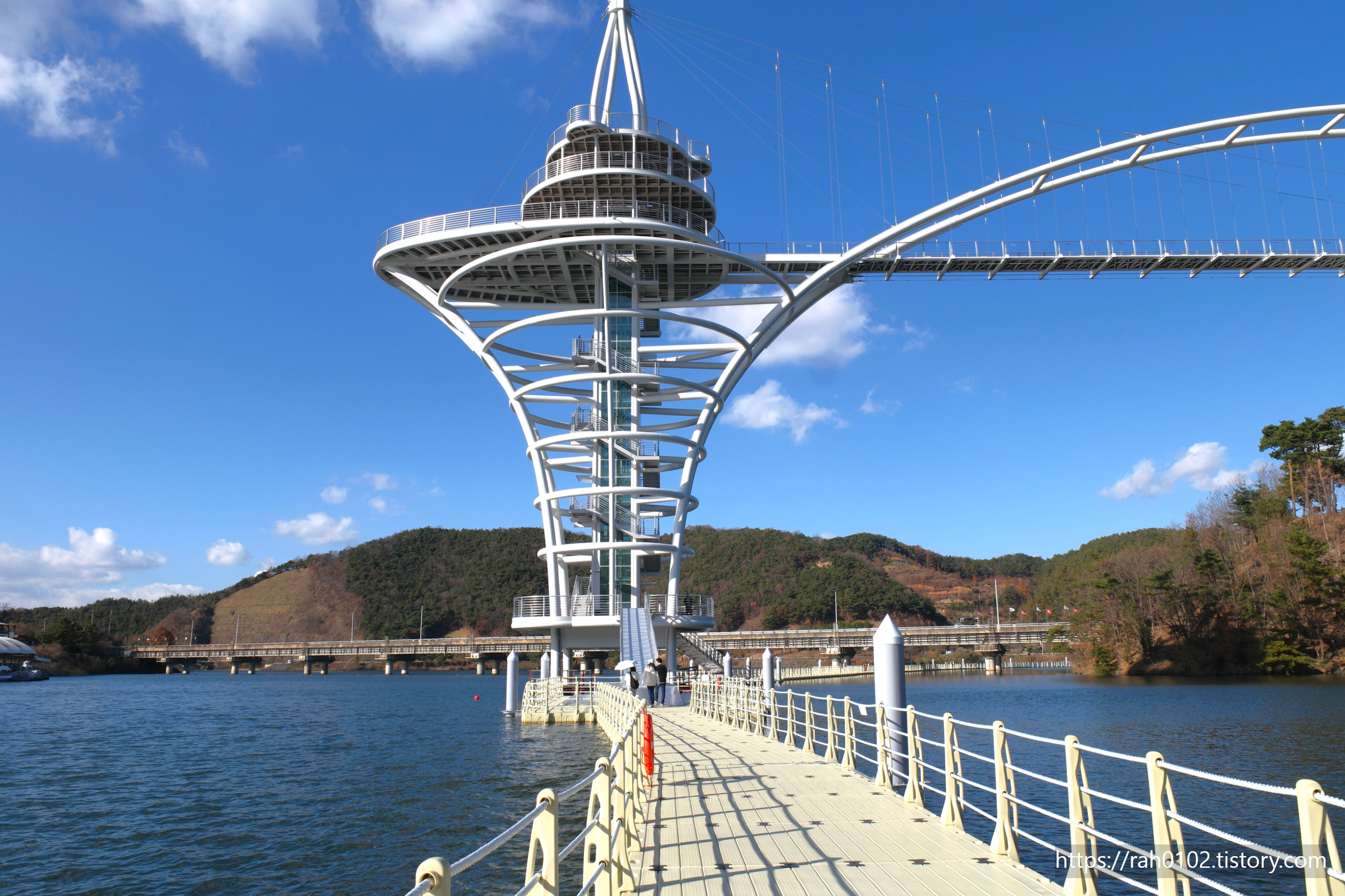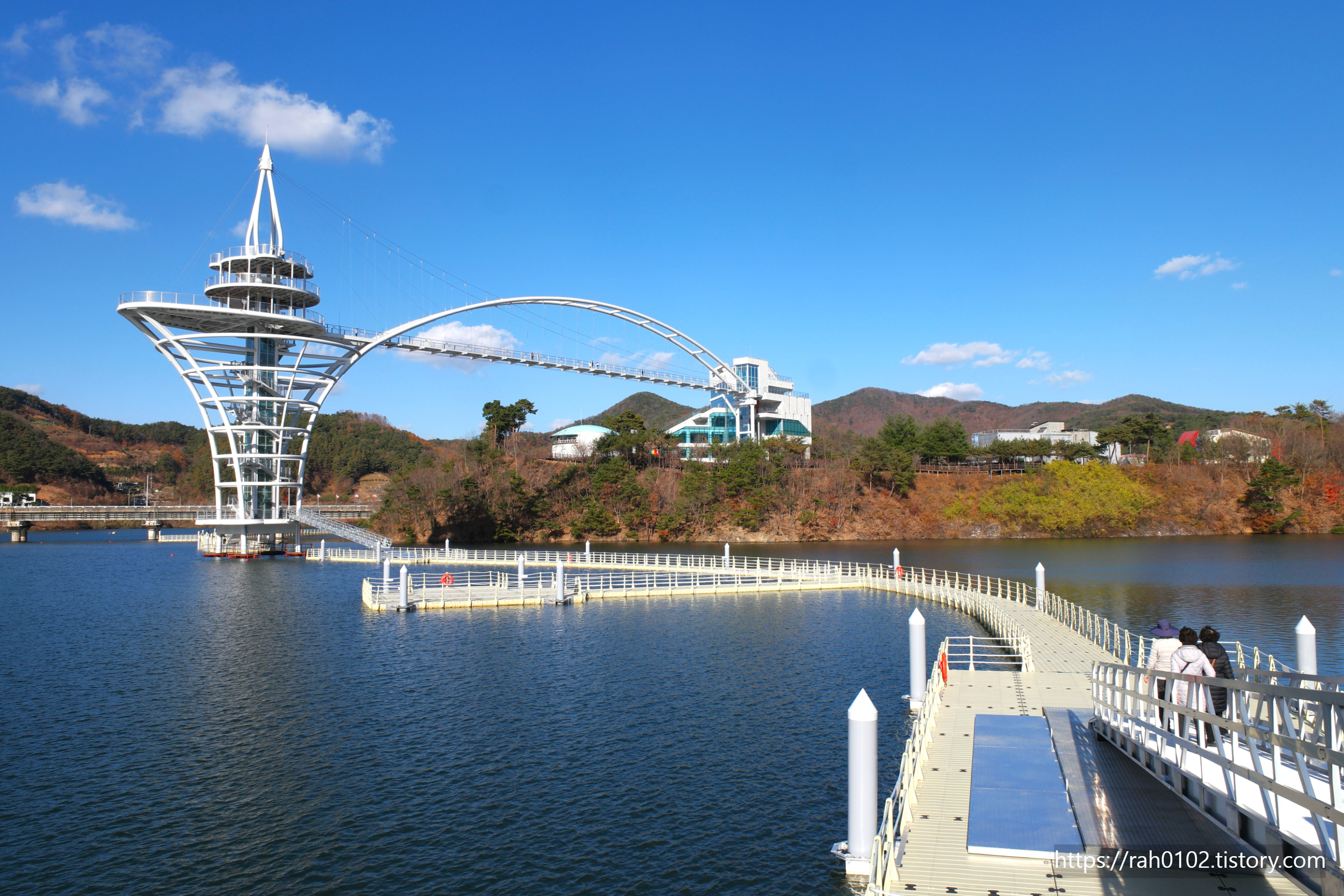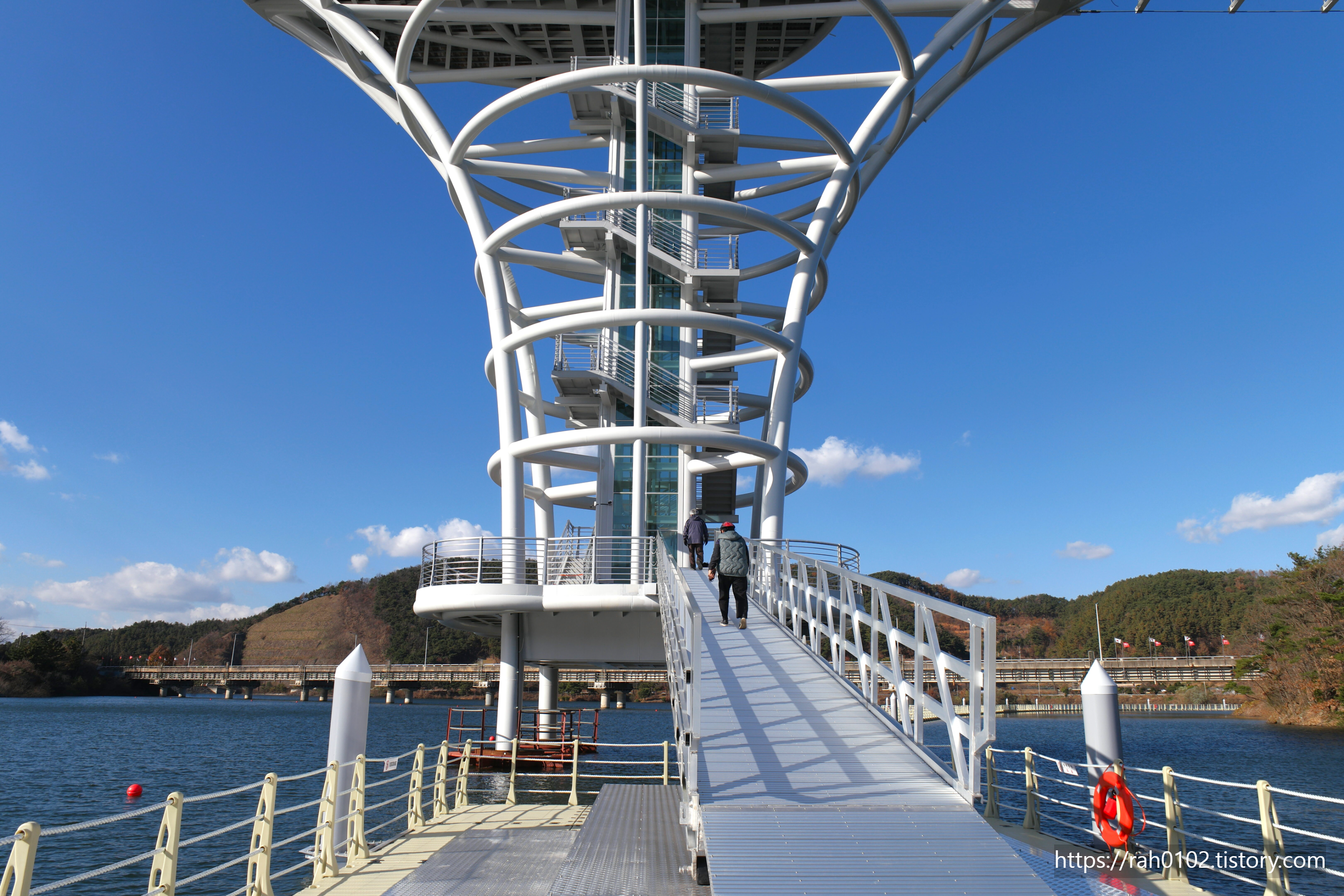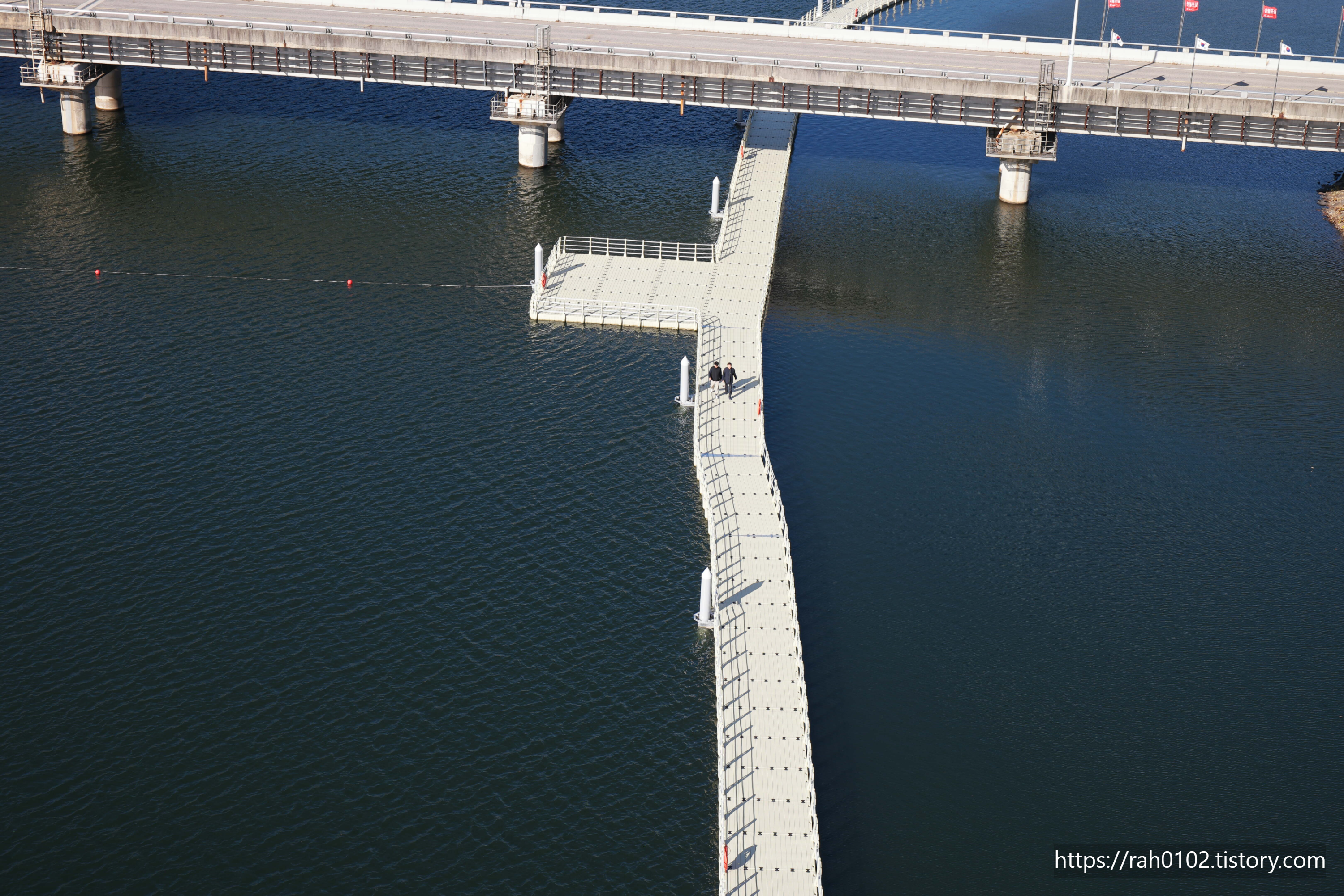 호수 위에 설치되어 있는 보행교를 걷기 위하여 엘리베이터를 타고 전망대 아래로 내려왔습니다. 현장 안내 직원분의 말에 의하면, 전망대를 기준으로 2개의 보행교가 설치되어 있는데, 한 곳의 길이는 150m이며, 다른 한 곳의 길이는 450m라고 했습니다. 먼저 150m 짜리 보행교를 걷기로 했습니다.