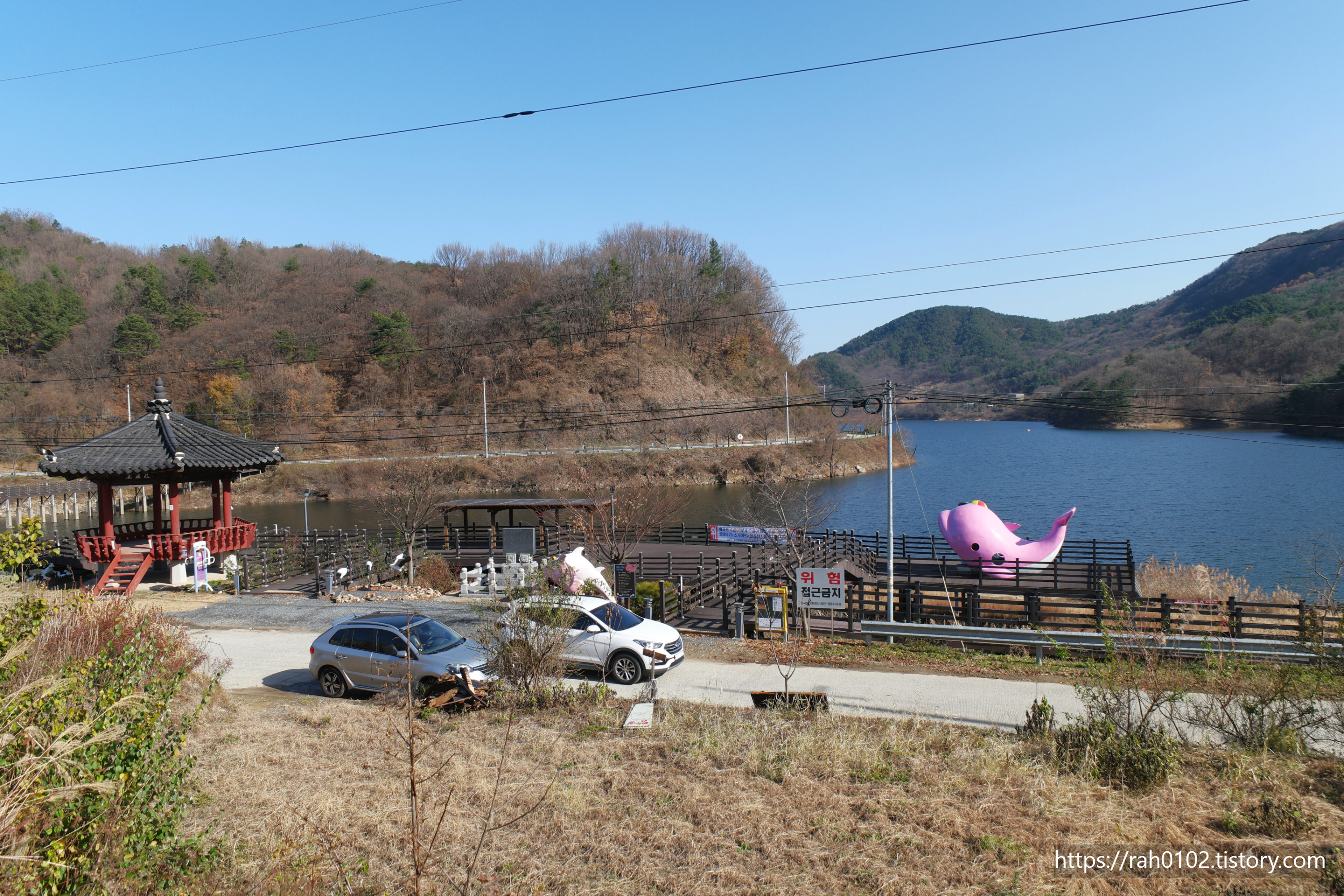 장찬고래마을은 마을 앞에 있는 장찬저수지가 하늘에서 내려다보면 고래를 닮았다고 해서 고래마을이란 이름을 갖게 되었다고 합니다. 몇 년 전 고래마을이 어떤 TV 프로그램에서 소개된 이후 이곳을 찾는 사람들이 많아졌다고 합니다.