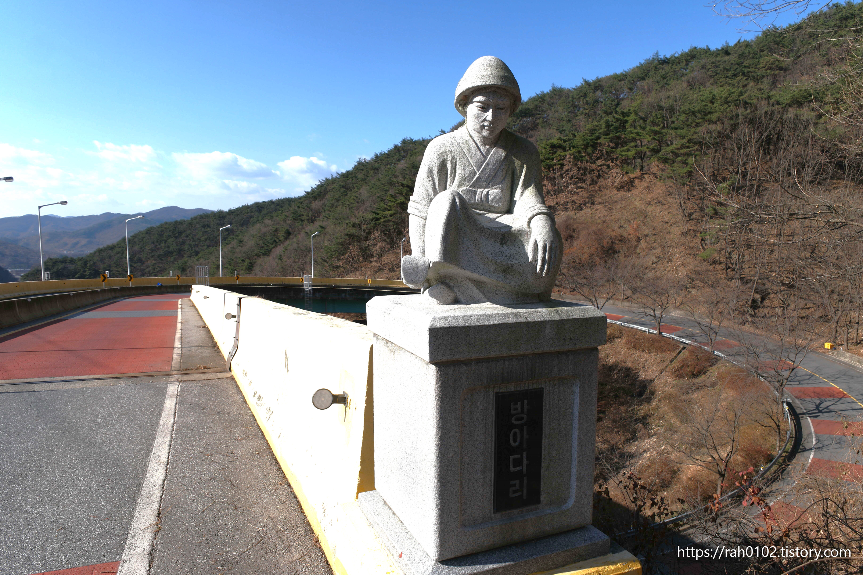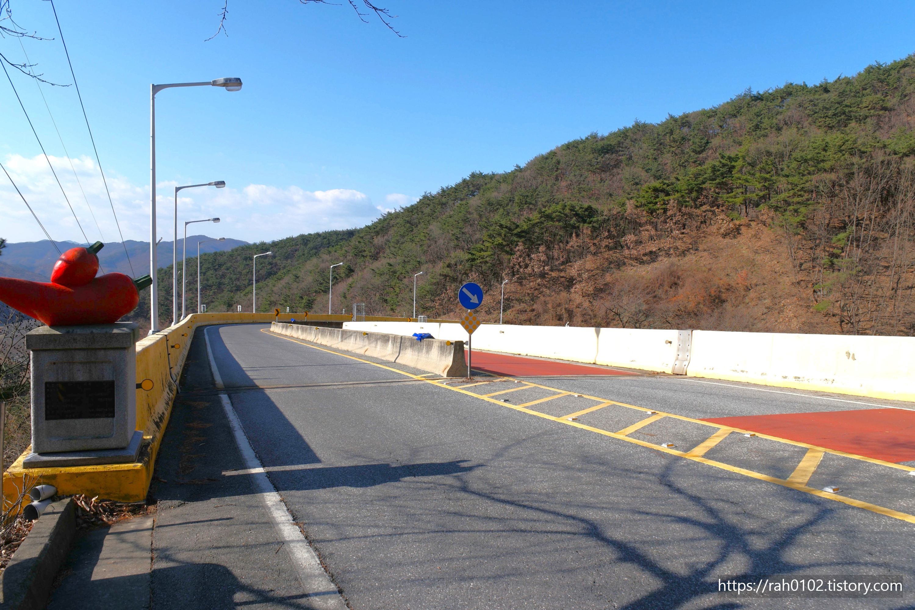 교각에 '방아다리'라는 이름이 붙여져 있는 것으로 보아 나선형도로 전 구간 중 교각 부분만을 '방아다리'라고 부르는 게 아닌가 싶습니다. 그리고 교각 입구 양쪽에 청양군의 특산물인 고추와 칠갑산의 콩밭 매는 아낙네의 조형물이 설치되어 있습니다.
