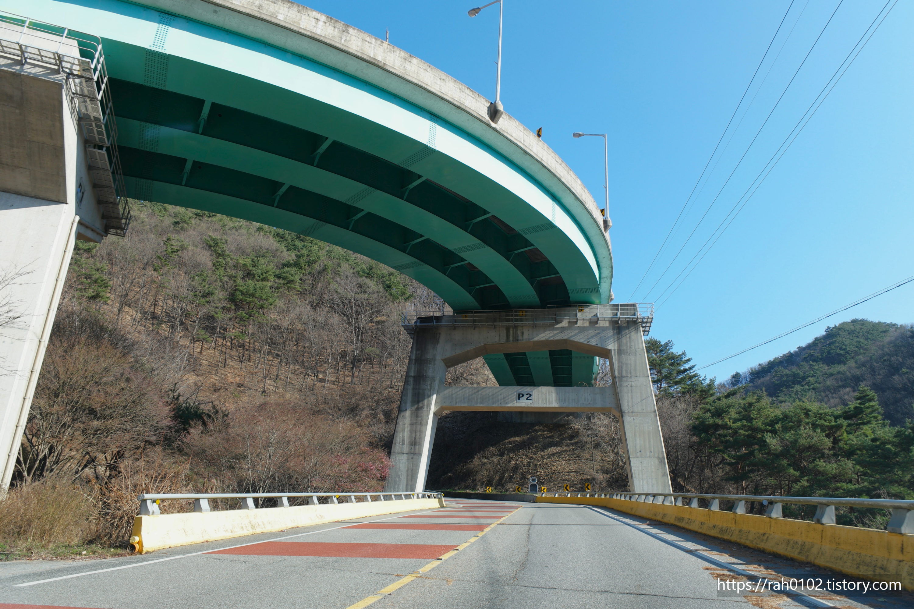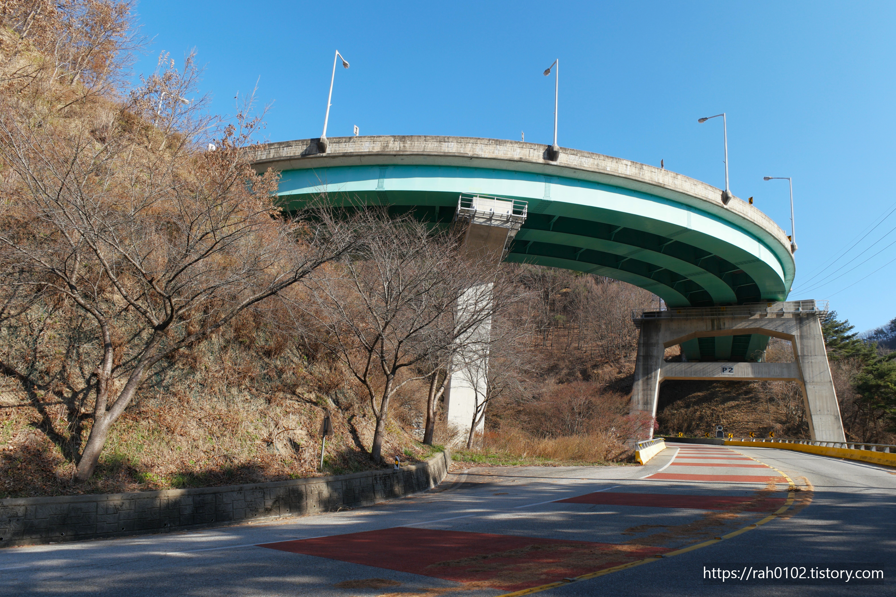 이러한 문제점을 해소하면서 자연 훼손 최소화 및 주변 경관과 조화도 고려하는 묘안으로 지금의 360° 나선형 회전 도로 방식이 채택됐다고 합니다. 길이는 287m, 폭은 13m(2차선). 반경은 33m라고 합니다. 고속도로 인터체인지 등을 제외한 우리나라 일반도로에서는 처음 시도된 형태라고 합니다. 또한 360°를 완벽하게 빙글 돌아서 차량이 운행되는 유일한 도로라고 합니다.(출처: 한국건설산업연구원 보도자료)